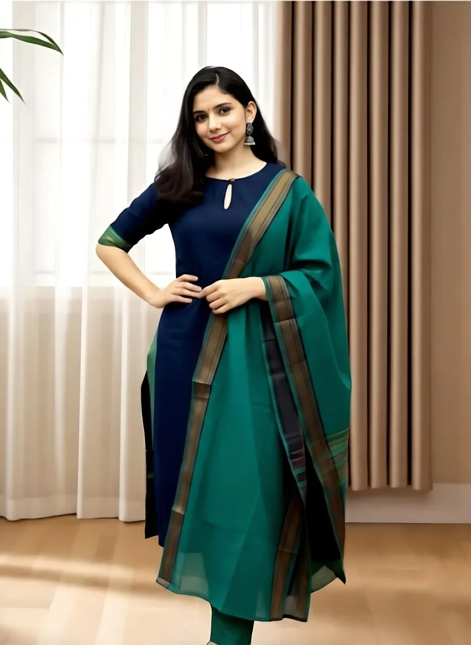 Paired with matching pants, this coordinated set offers a polished and cohesive look that balances traditional aesthetics with modern fashion sensibilities. With precise stitching and attention to detail, the Dameque Aqua Blue Cotton Kurti Pant Set is a versatile addition to your wardrobe that elevates your ethnic style with effortless charm.
